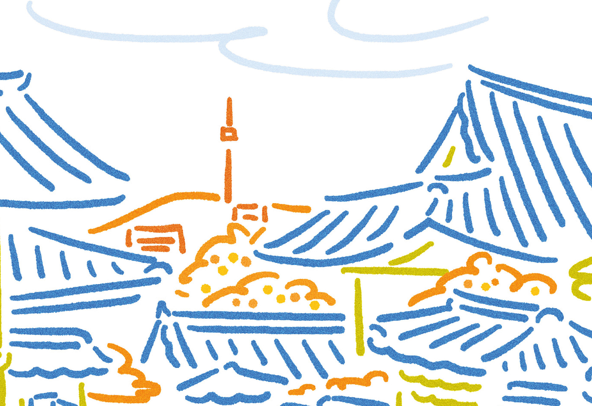 I drew a line drawing of Bukchon Hanok Village in autumn with a view of Namsan Tower.